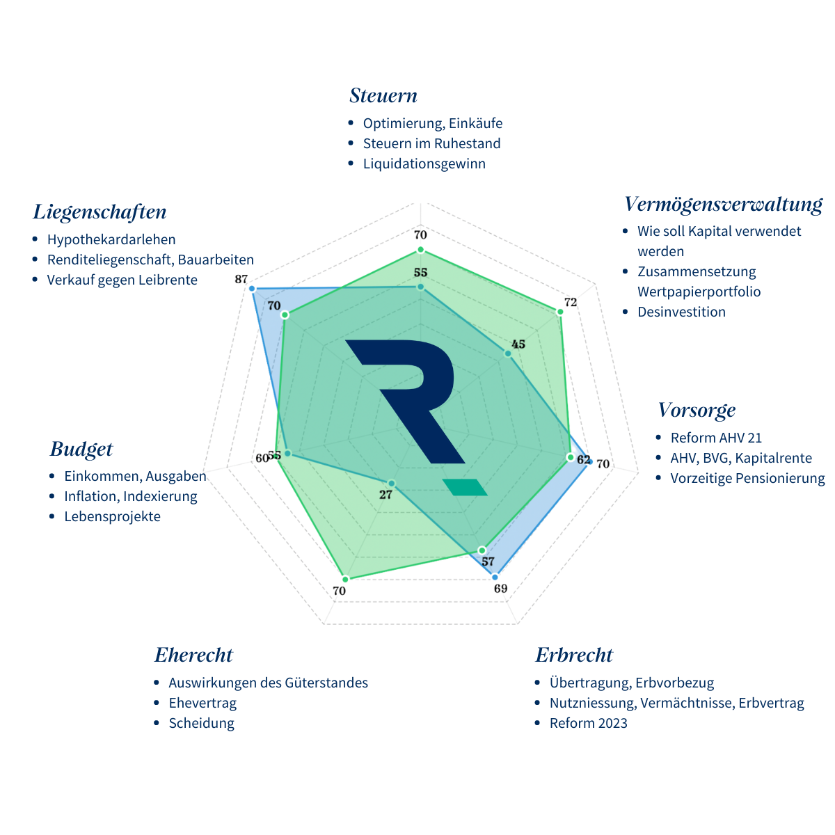 Dieser umfassende vermögensrechtliche Ansatz umfasst sowohl die vermögensrechtlichen als auch die steuerrechtlichen, erbrechtlichen und vorsorglichen Aspekte. Er verschafft Ihnen somit einen umfassenden Überblick und ein sicheres Gefühl bei der Entscheidungsfindung.